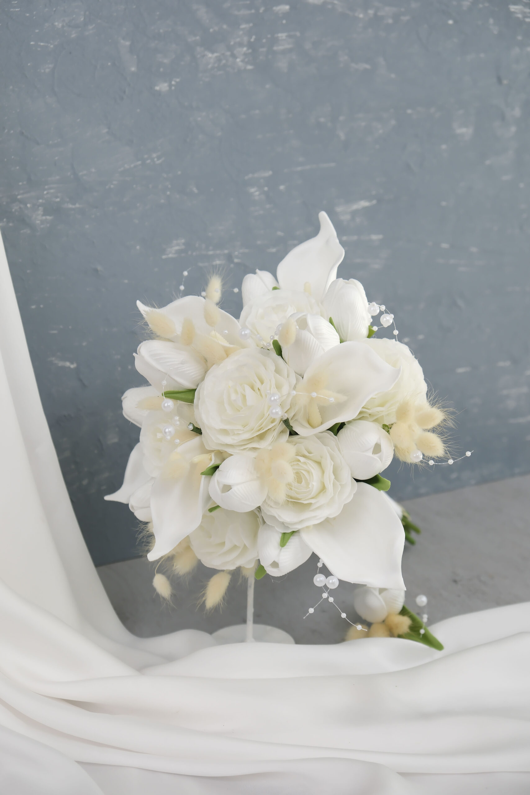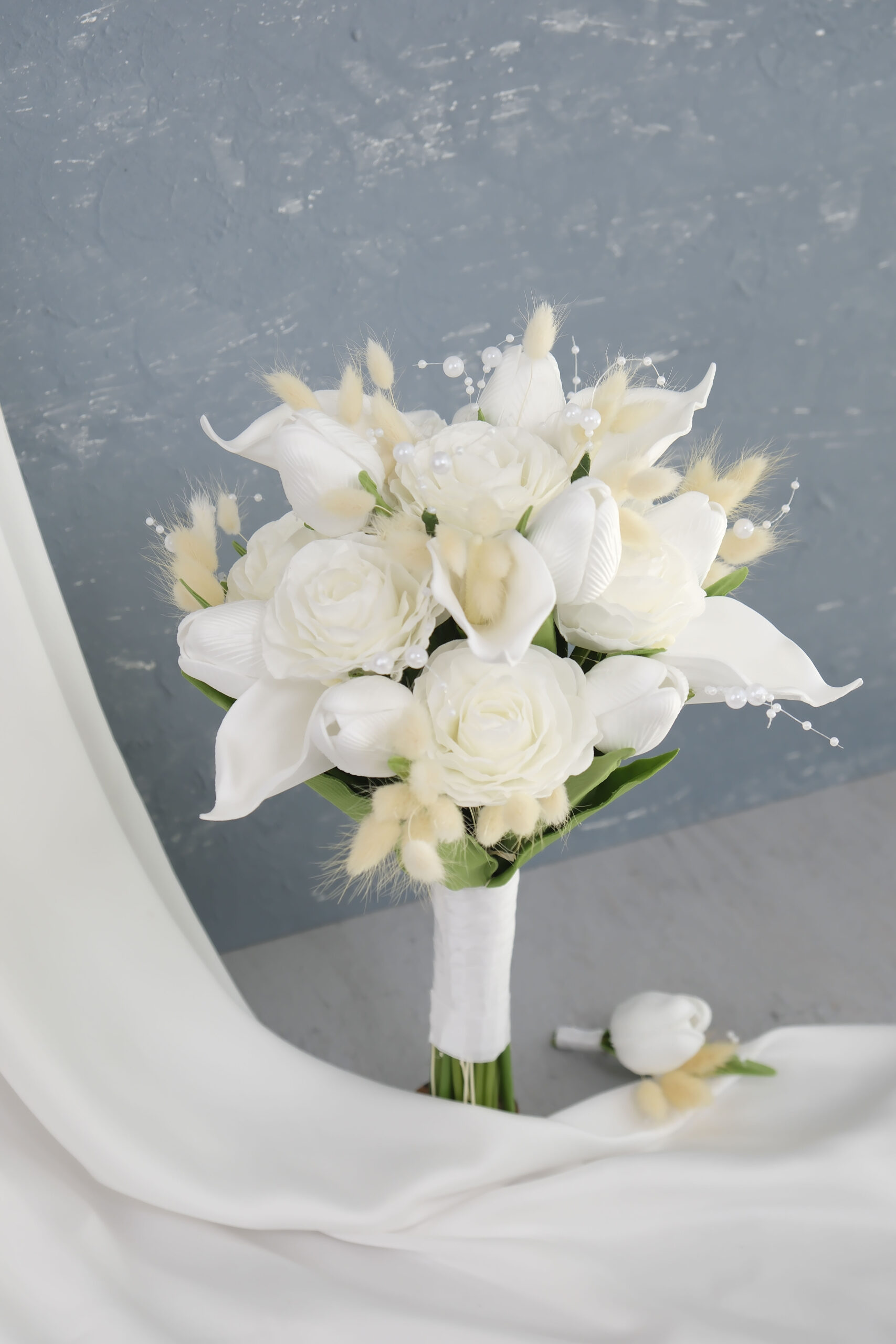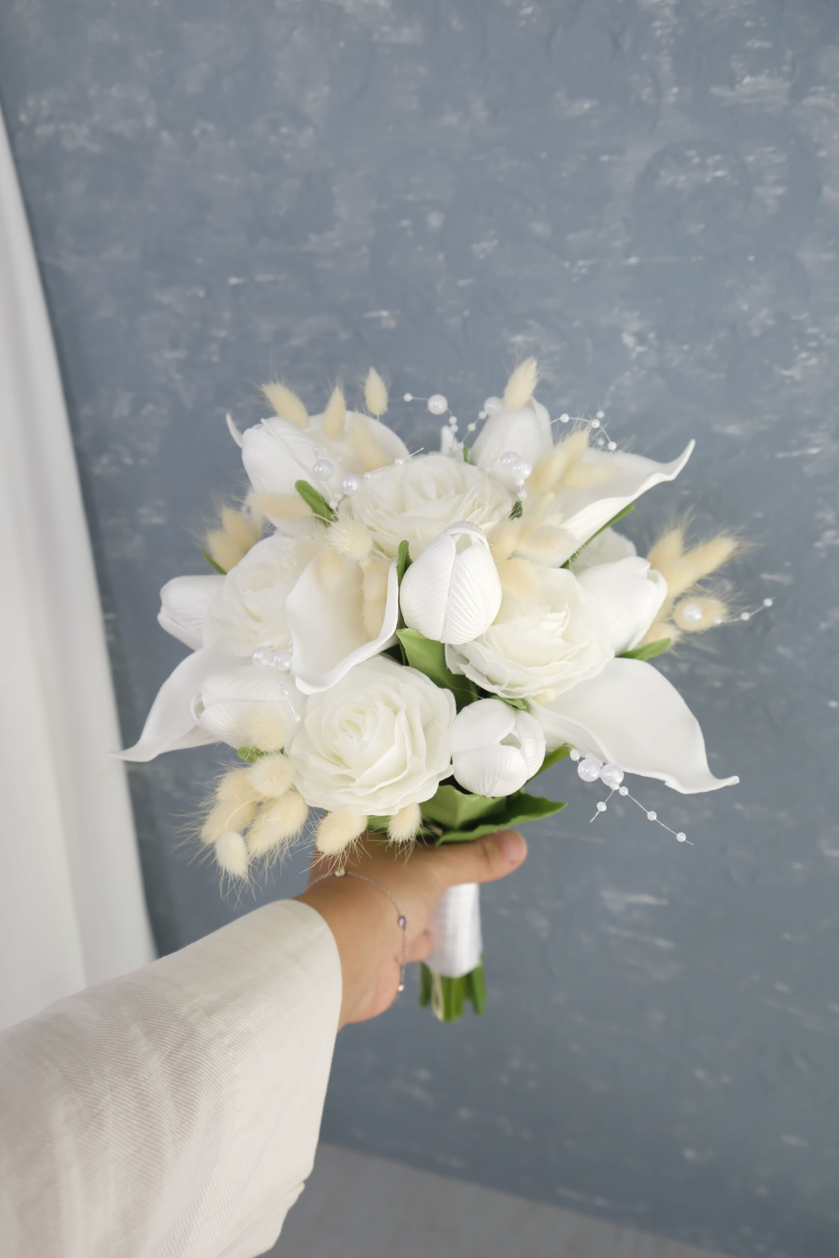 Islak Gala Lale ve İthal yaprak ile yapılan orta boy gelin çiçeği. Beyaz renkler temel olarak esas alınmıştır.