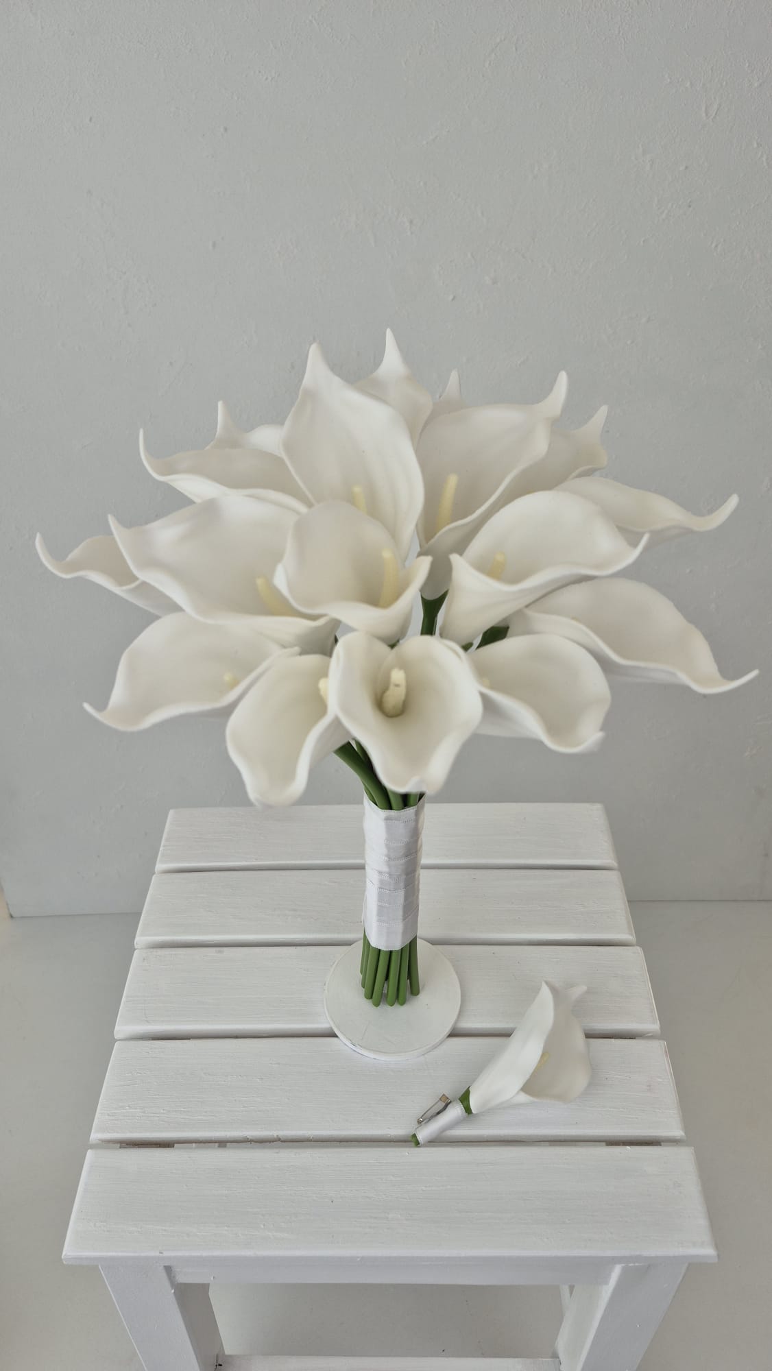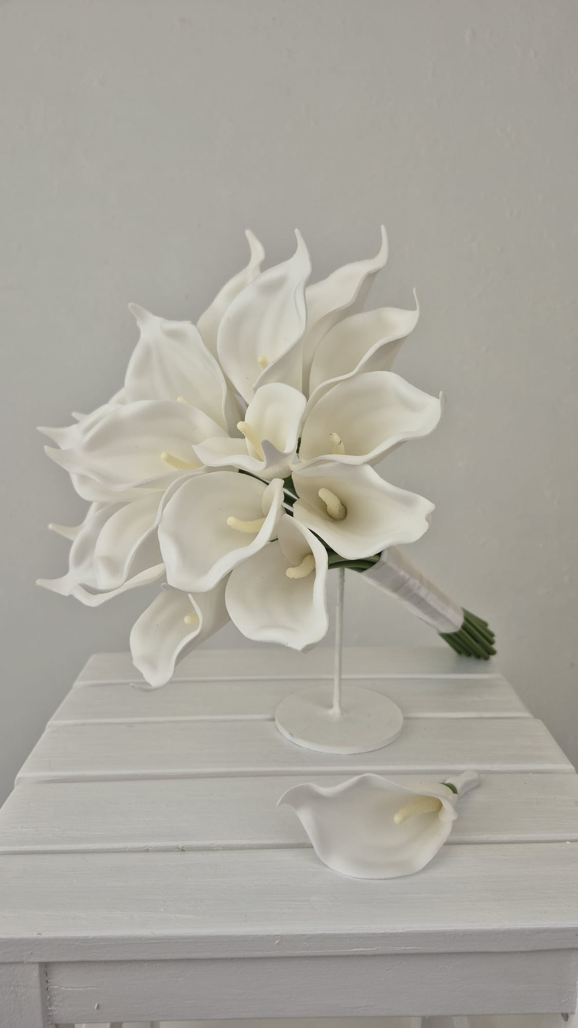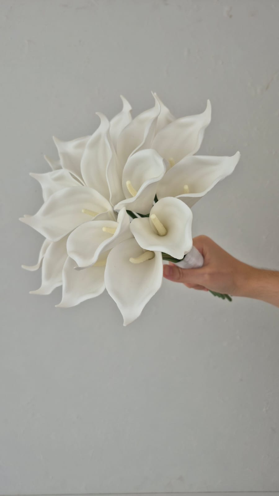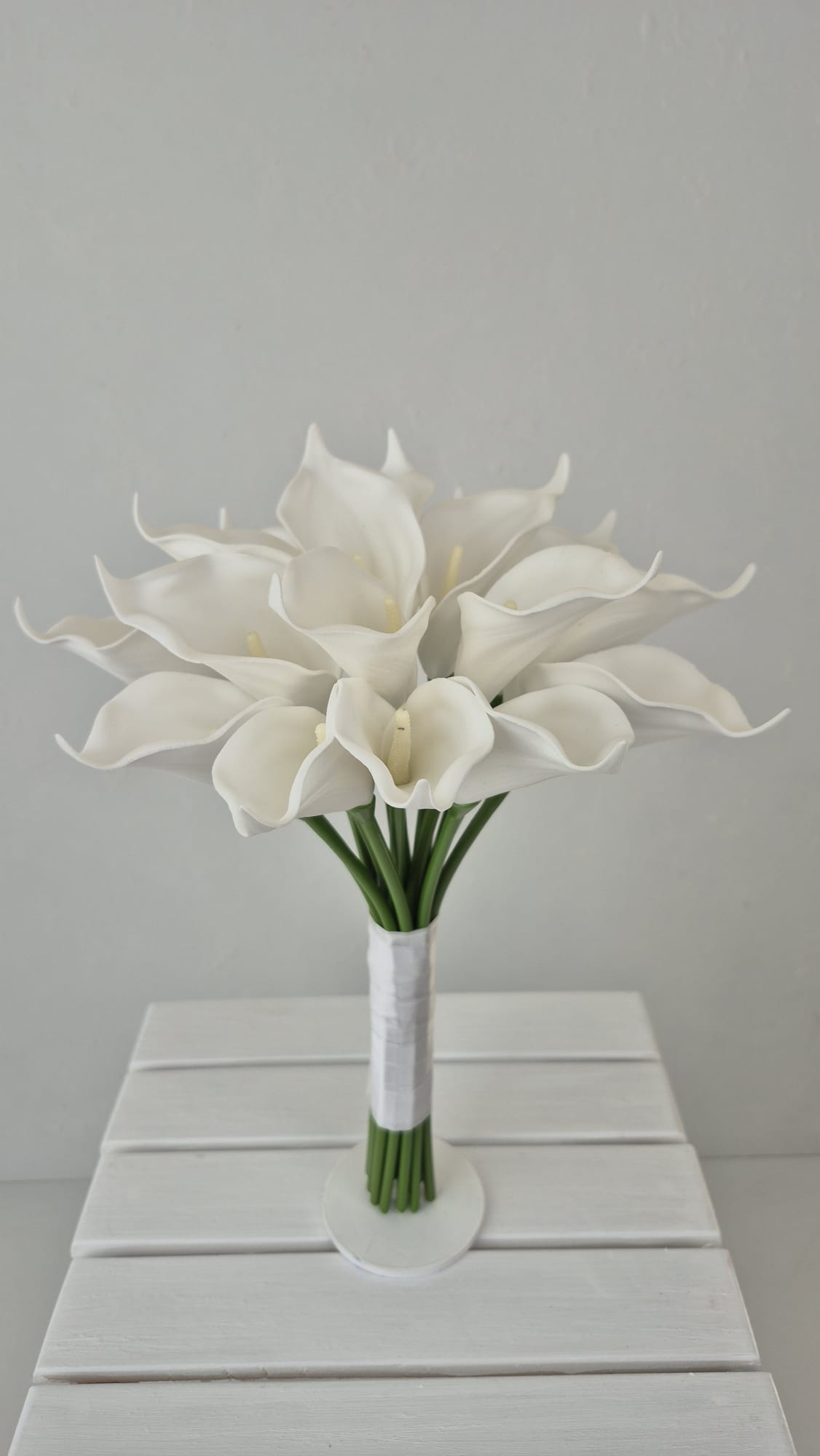 Islak gala ile yapılan orta boy gelin çiçeği. Beyaz renkler temel olarak esas alınmıştır.