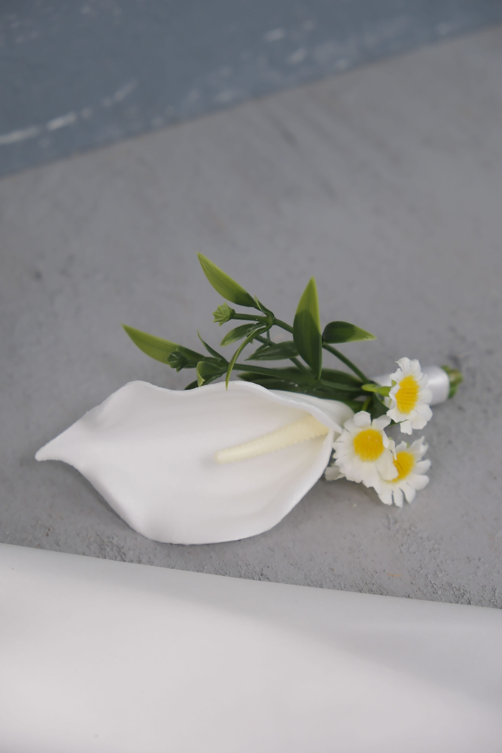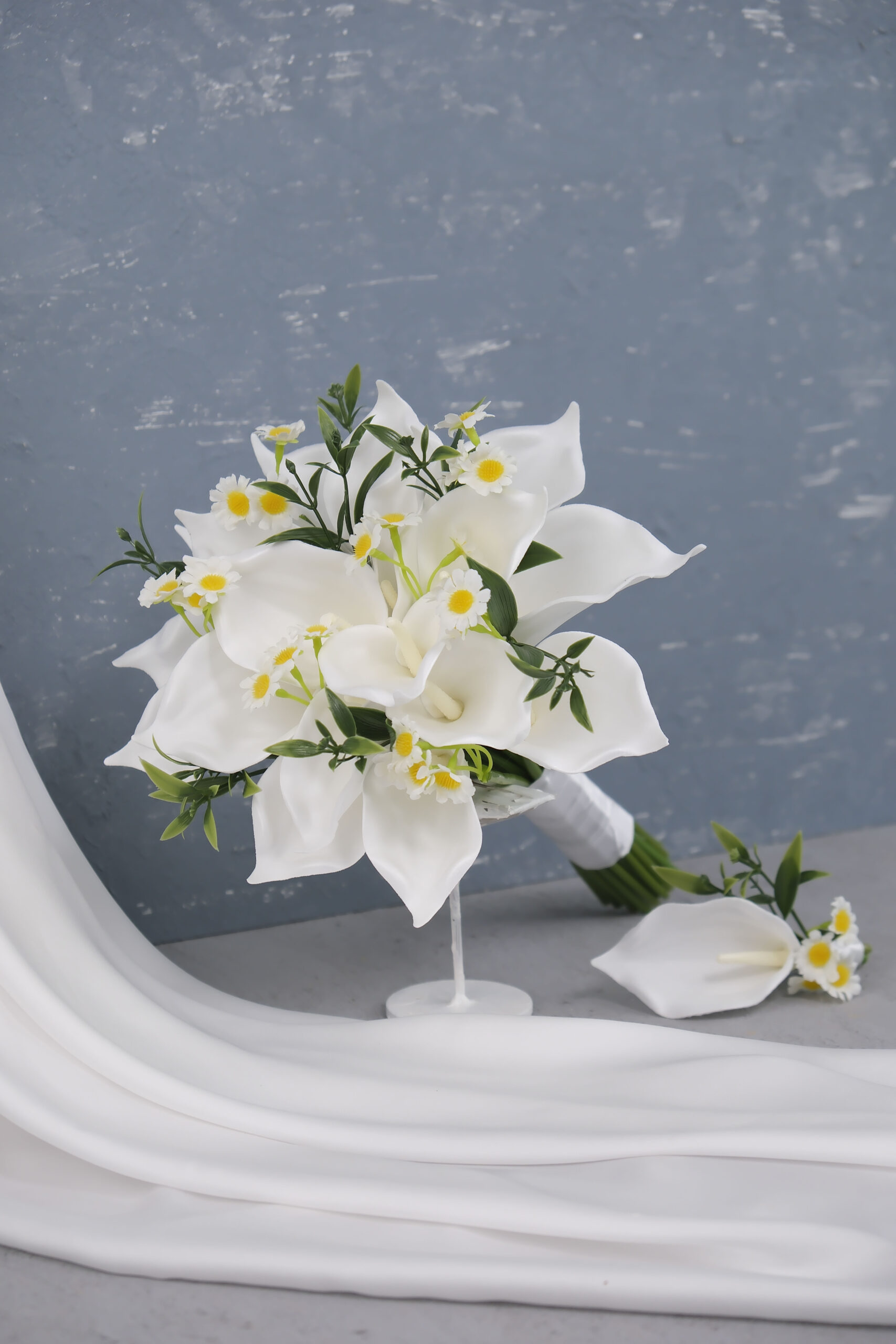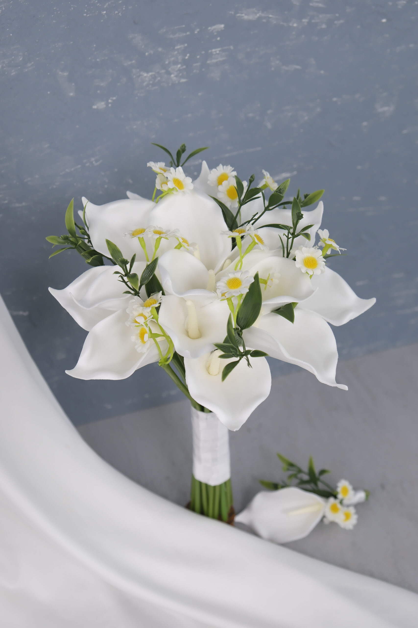 Islak gala ile yapılan orta boy gelin çiçeği. Beyaz renkler temel olarak esas alınmıştır.