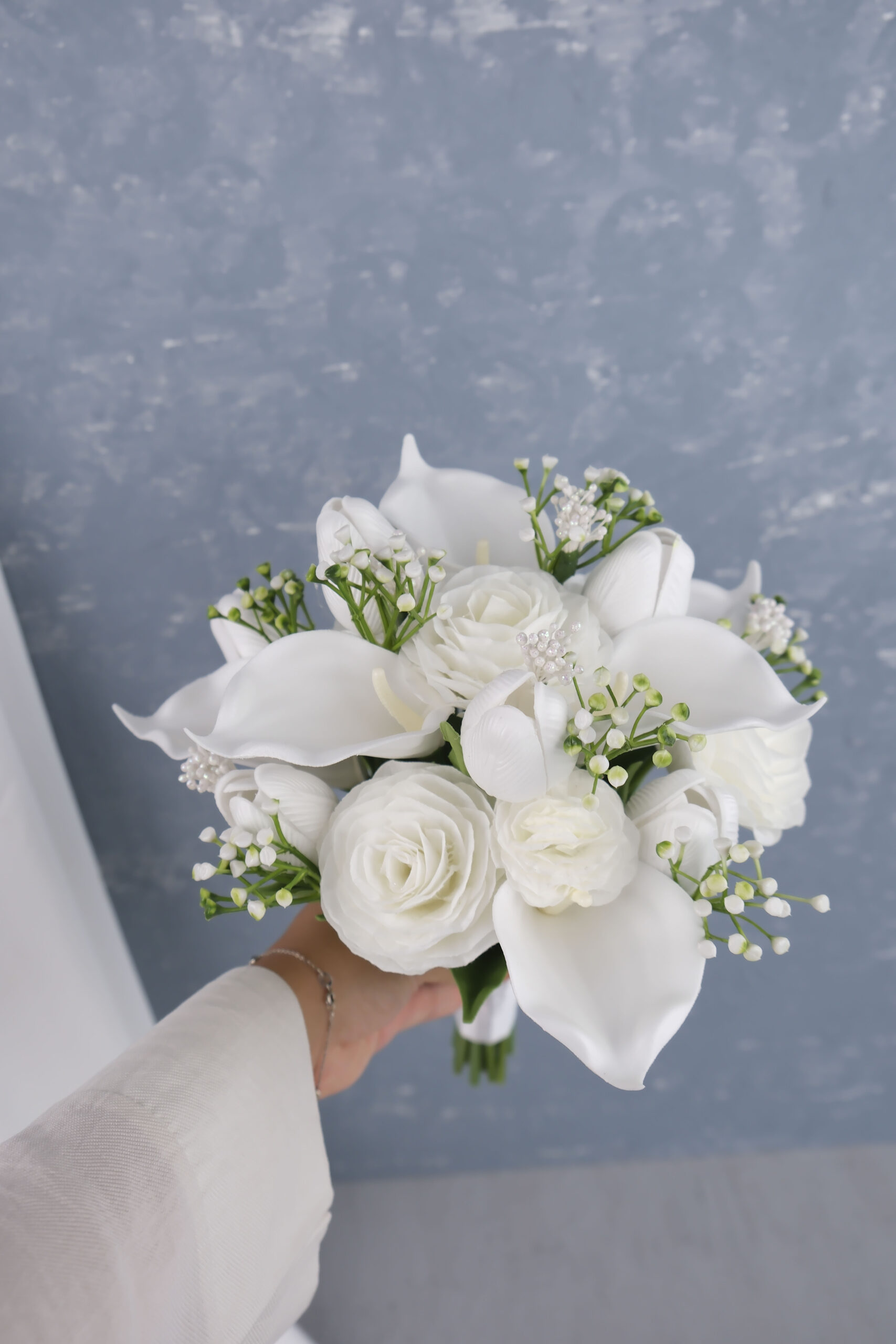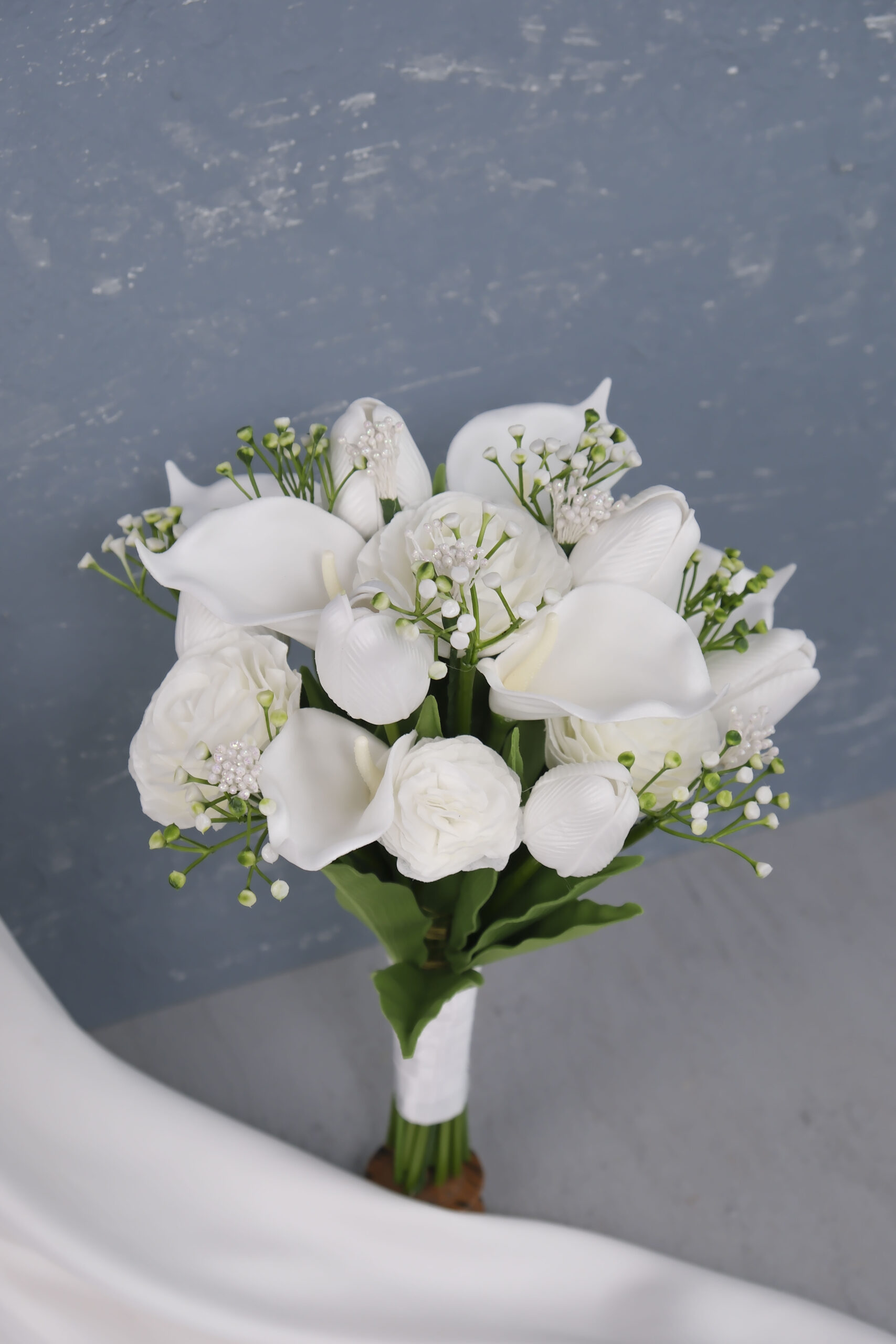 İncili Püsküllü Islak Lale ve İthal yaprak ile yapılan orta boy gelin çiçeği. Beyaz renkler temel olarak esas alınmıştır.