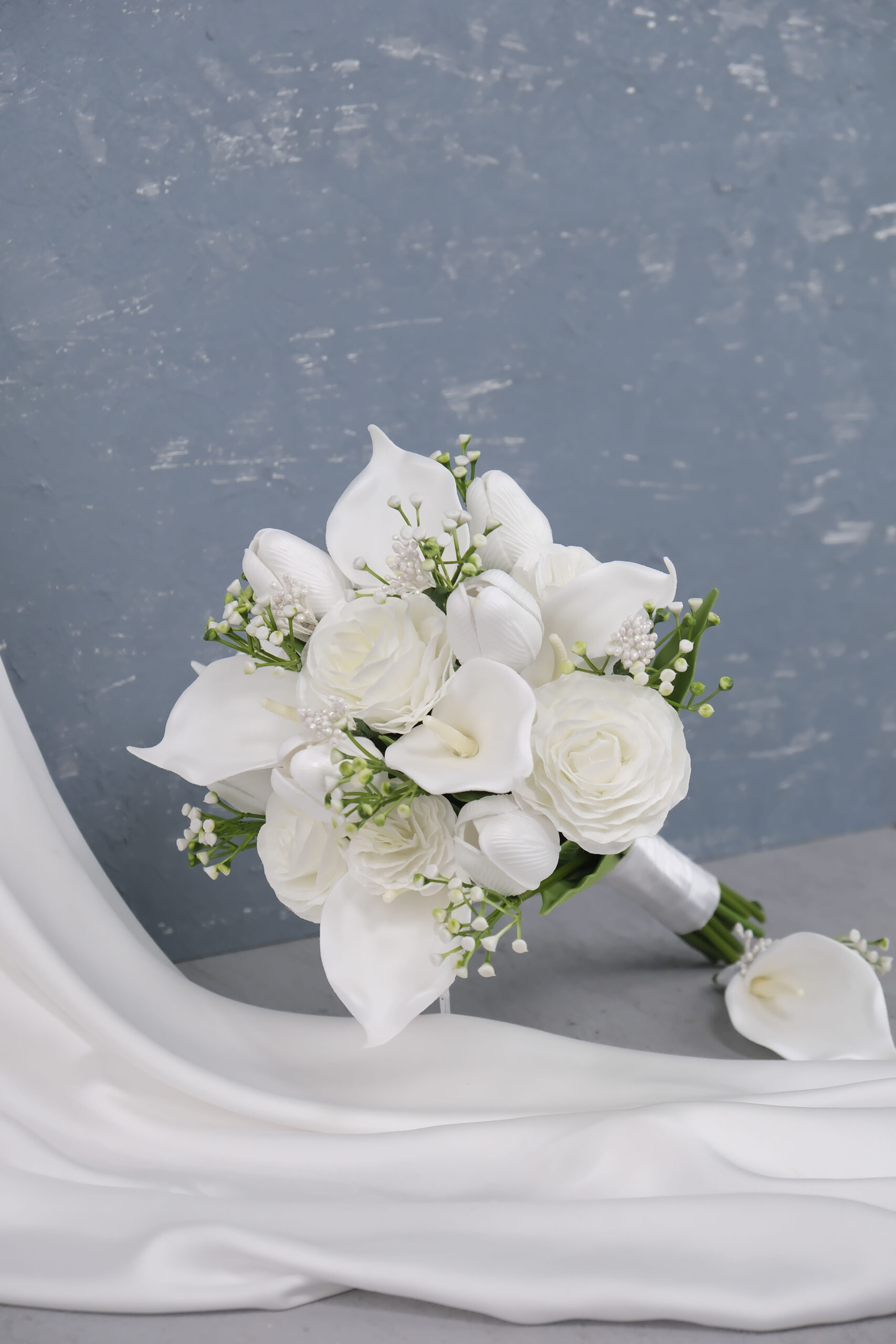 Islak Lale Gala Gül ve İthal yaprak ile yapılan orta boy gelin çiçeği.Beyaz renk temel olarak esas alınmıştır.