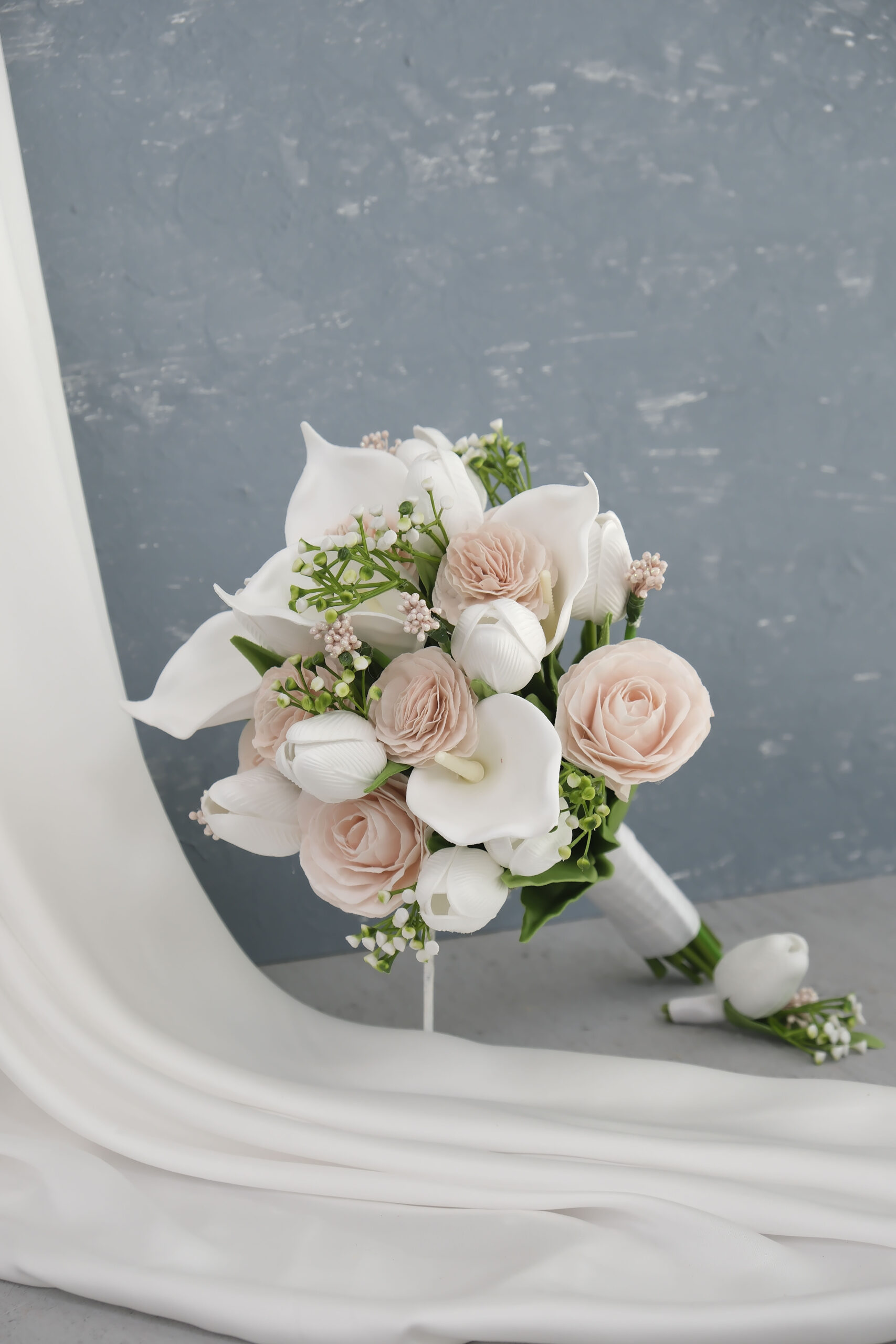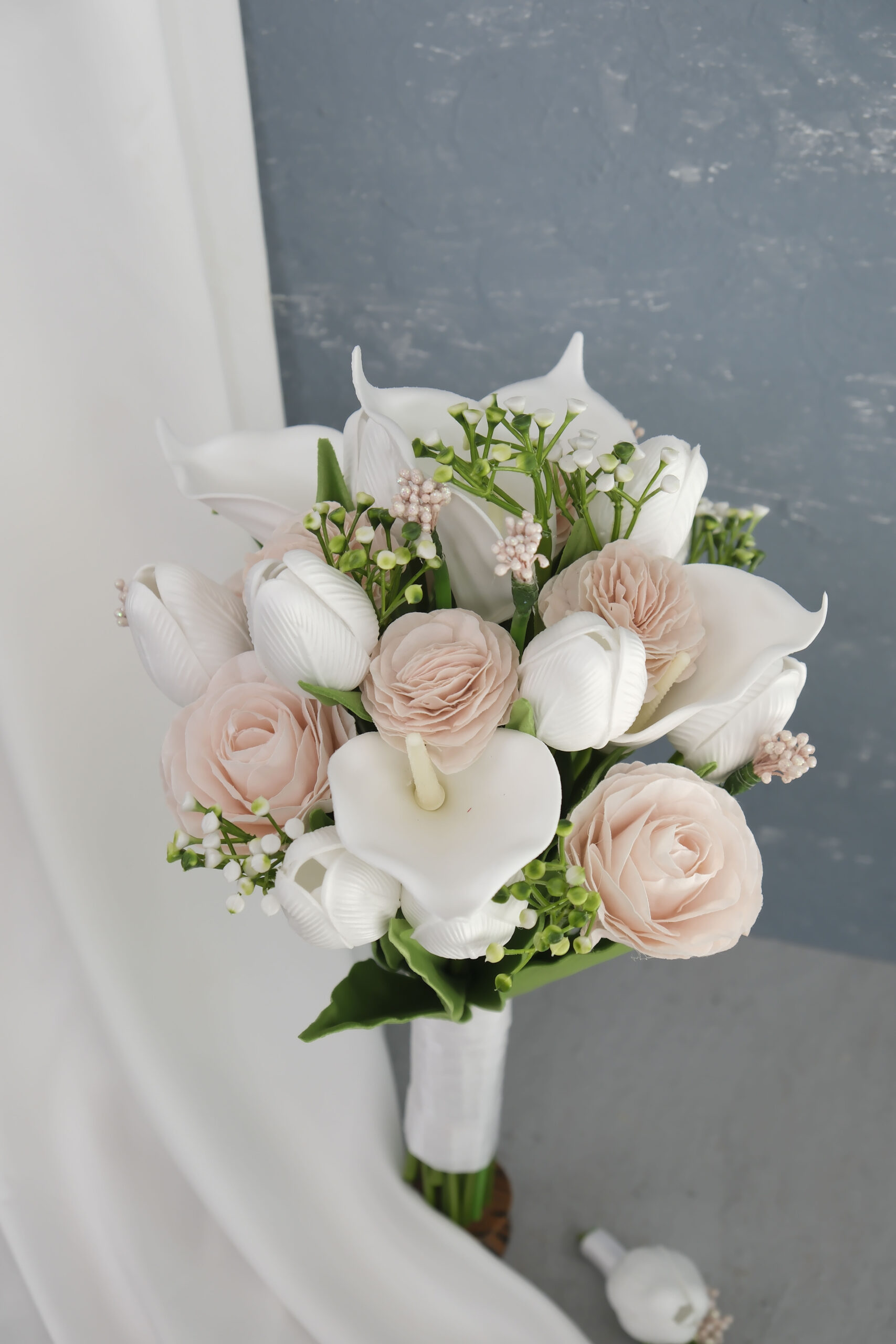 Lale, gül, gala, ithal yaprak ile yapılan orta boy gelin çiçeği. Beyaz ve soft pembe renkler temel olarak esas alınmıştır.