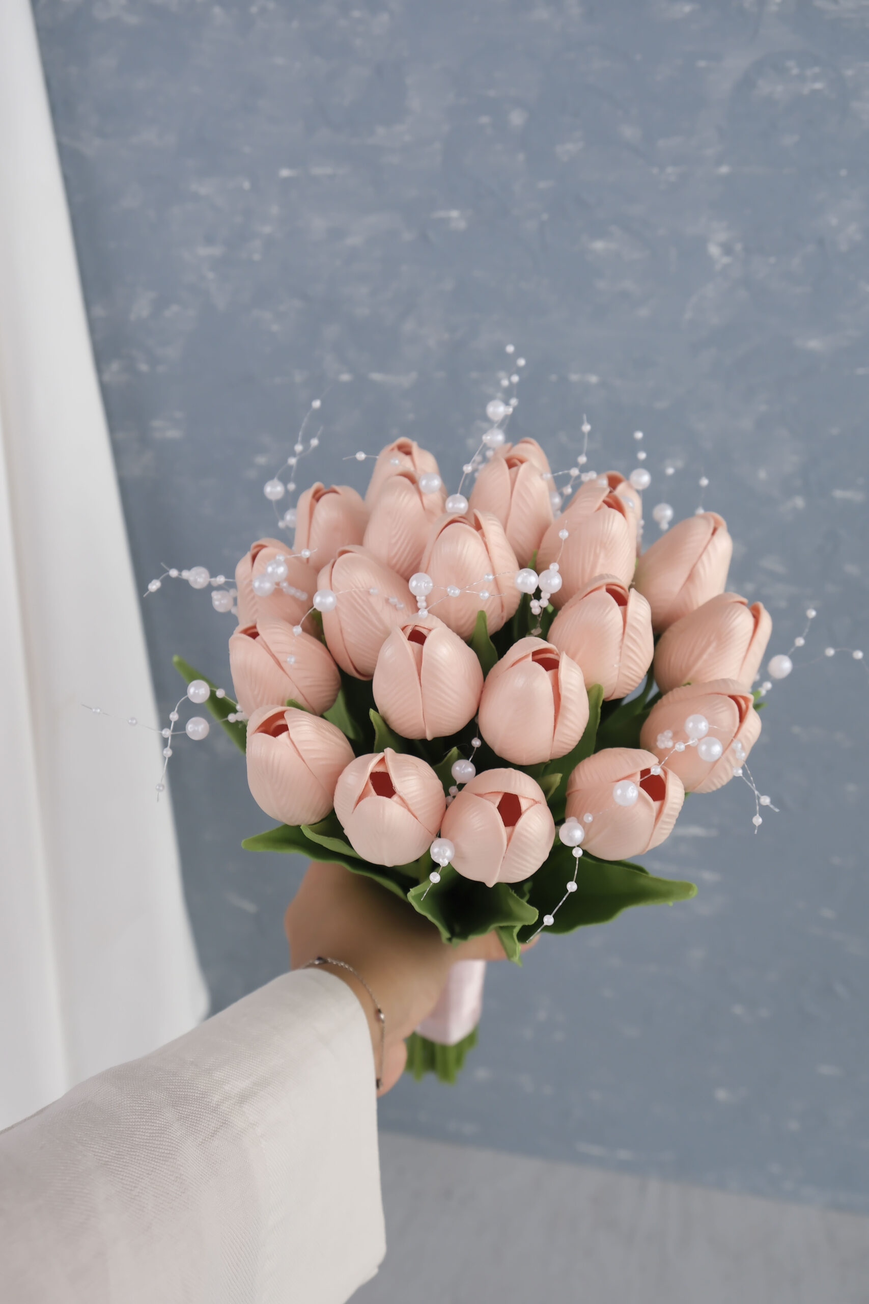İncili Islak Toz Pembe Lale Gelin Buketi